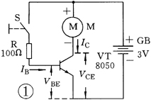 三极管电子开关电路 见图1 。由开关三极管VT,玩具电动机M,控制开关S,基极限流电阻器R和电源GB组成。VT采用NPN型小功率硅管8050,其集电极最大允许电流ICM可达1.5A,以满足电动机起动电流的要求。M选用工作电压为3V的小型直流电动机,对应电源GB亦为3V 。 VT基极限流电阻器R如何确定呢?根据三极管的电流分配作用,在基极输入一个较弱的电流IB,就可以控制集电极电流IC有较强的变化。假设VT电流放大系数hfe≈250,电动机起动时的集电极电流IC=1.5A,经过计算,为使三极管饱和导通所需的基极电流IB≥(1500mA/250)×2=12mA。在图1电路中,电动机空载时运转电流约为500mA,此时电源(用两节5号电池供电)电压降至2.4V,VT基极-发射极之间电压VBE≈0.9V。根据欧姆定律,VT基极限流电阻器的电阻值R=(2.4-0.9)V/12mA≈0.13kΩ。考虑到VT在IC较大时,hfe要减小,电阻值R还要小一些,实取100Ω。为使电动机更可靠地启动,R甚至可减少到51Ω。在调试电路时,接通控制开关S,电动机应能自行启动,测量VT集电极—发射极之间电压VCE≤0.35V,说明三极管已饱和导通,三极管开关电路工作正常,否则会使VT过热而损坏。 自动灭火的热量自动控制电路 见图2。该电路是将图1中的控制开关S换成双金属复片开关ST,就成为热控电路了。当蜡烛火焰烧烤到双金属复片时,复片趋于伸直状态,使得开关ST接通,电动机启动,带动小风扇叶片旋转,对准蜡烛吹风,自动将火焰熄灭;当双金属片冷却后,开关断开,小电风扇自动停转,完成了自动灭火的程序。 自动停车的磁力自动控制电路 见图3。开启电源开关S,玩具车启动,行驶到接进磁铁时,安装在VT基极与发射极之间的干簧管SQ闭合,将基极偏置电流短路,VT截止,电动机停止转动,保护了电动机及避免大电流放电。